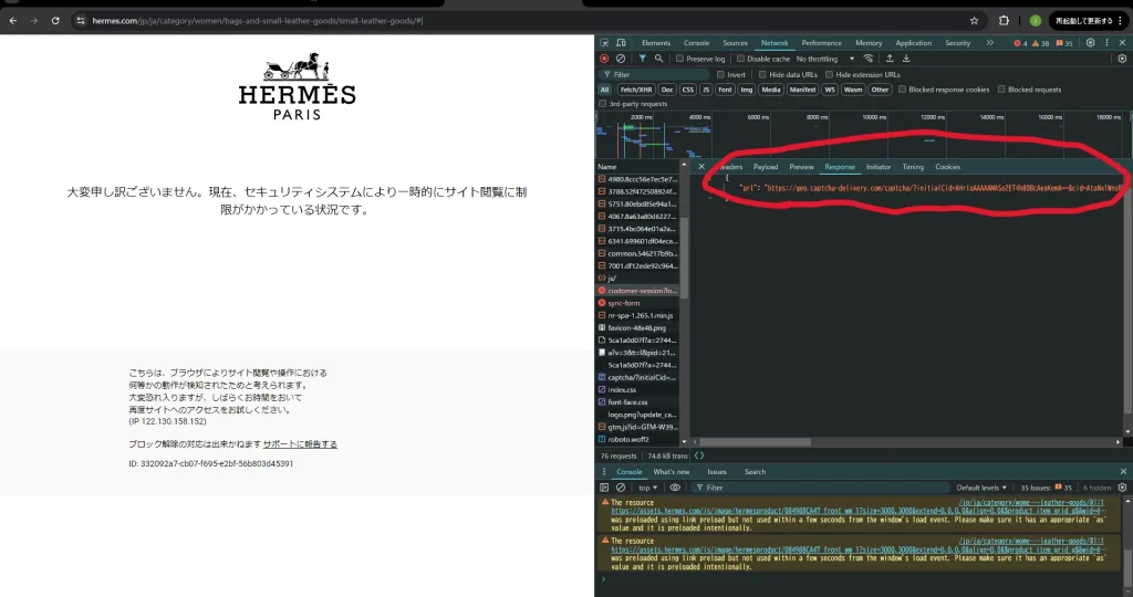 Captchaにもいろんな種類があり、今回のエルメスオンラインには「DataDome」という種類のCaptchaが組み込まれている。(調べ方は割愛)