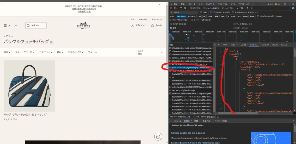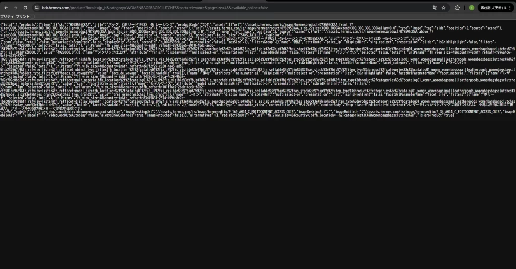 これがエルメスオンラインの在庫商品情報を管理するバックエンドから情報を引き出しているAPIのようである。