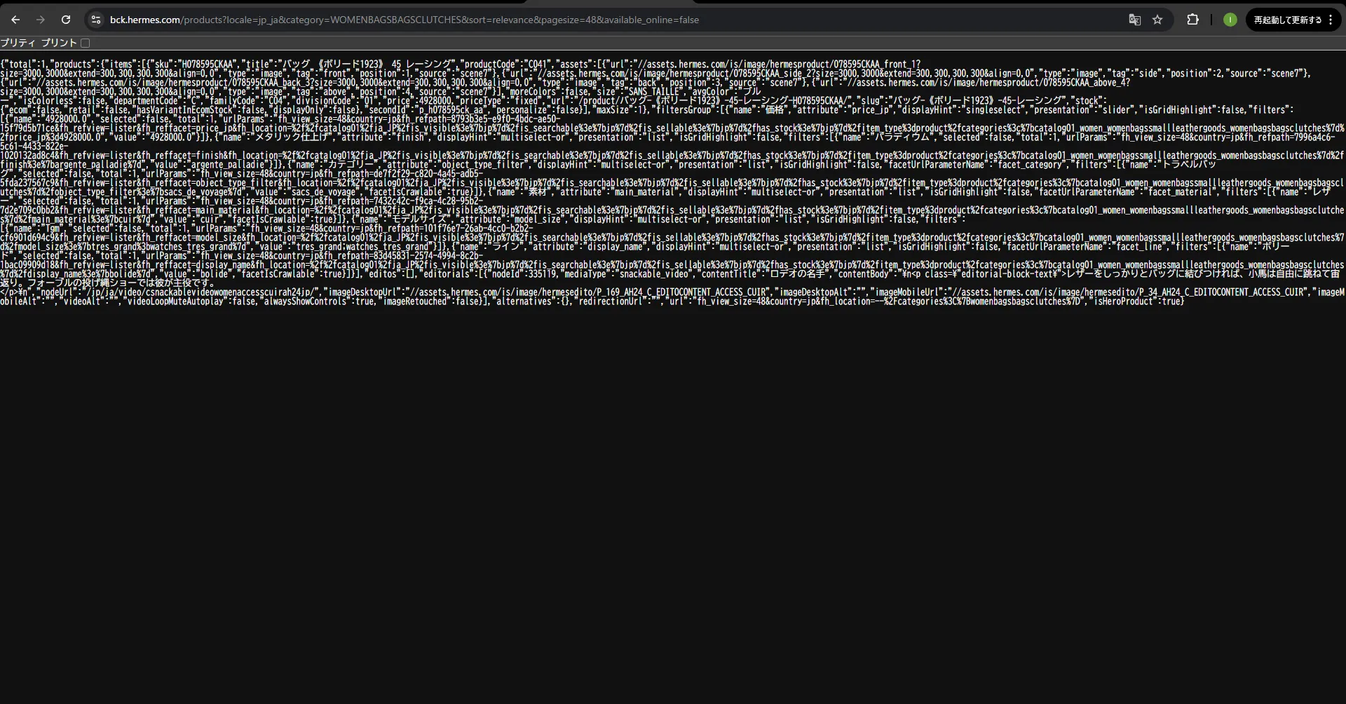 "https://bck.hermes.com/products?urlParams=fh_view_size=48%26country=jp%26fh_refpath=de7f2f29-c820-4a45-adb5-5fda237567c9%26fh_refview=lister%26fh_reffacet=object_type_filter%26fh_location=%252f%252fcatalog01%252fja_JP%252fis_visible%253e%257bjp%257d%252fis_searchable%253e%257bjp%257d%252fis_sellable%253e%257bjp%257d%252fhas_stock%253e%257bjp%257d%252fitem_type%253dproduct%252fcategories%253c%257bcatalog01_women_womenbagssmallleathergoods_womenbagsbagsclutches%257d&locale=jp_ja&category=WOMENBAGSBAGSCLUTCHES&sort=relevance&pagesize=48&available_online=false",
