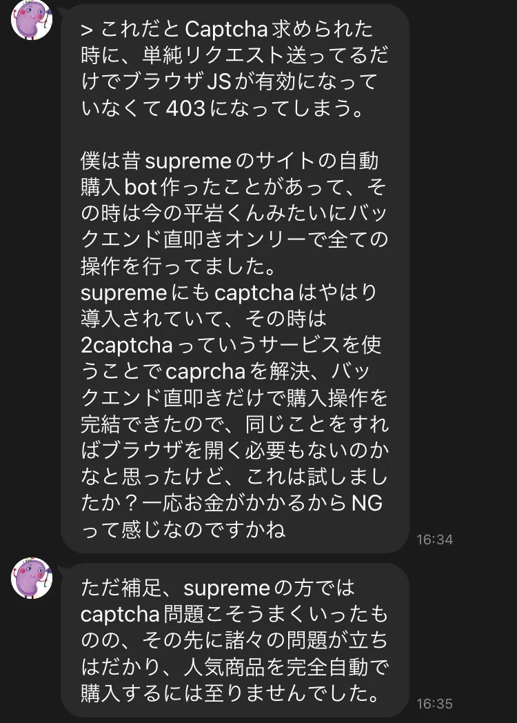 すると彼も同じようなことをしようとしていたらしい。そして結論、開発は断念したとのことだったが、途中までは「2captcha」というCaptcha突破サービスを使用していたとのこと。