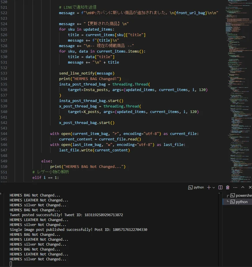 これが現状の成功した方法になる。ただ、この方法はちょっと秘密にさせてほしい。ネットでは同じようにエルメスの更新通知BOTを血眼で作っている人もいるので、それだけ価値があるという認識でいるためである。